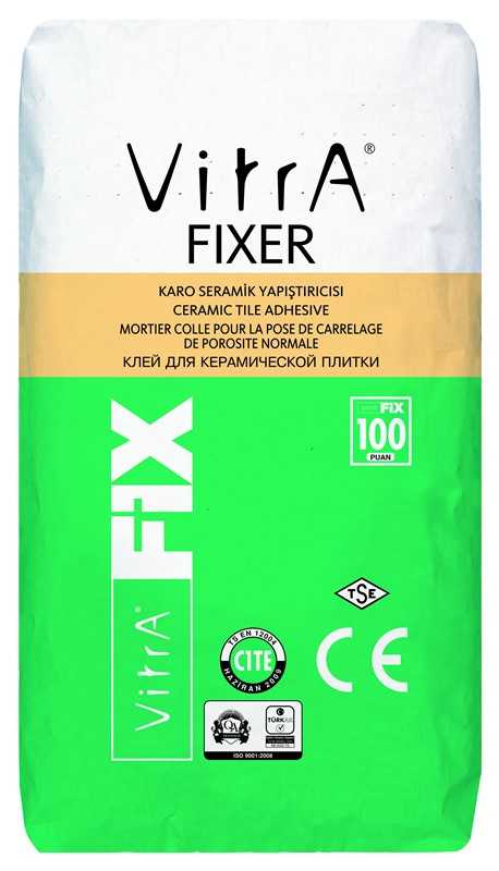 Description: Cement based tile adhesive for fixing small and medium sized ceramic tiles (up to 33X33 cm in sizes with water absorption ratio > %3) onto walls and floors. It is non-slip by its tixotrophic feature. It allows quick and easy tiling with its extended application time feature.